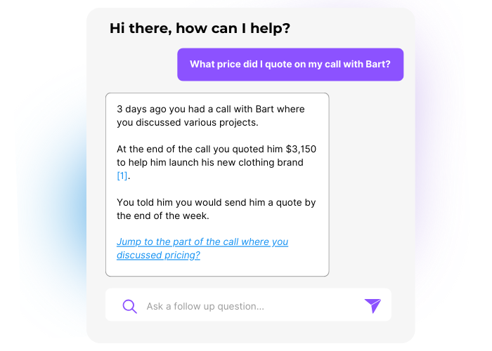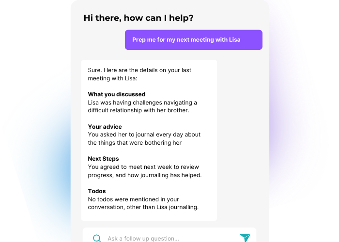 Ask the AI anything about a client, and instantly get a summary of who they are, what you last discussed, and all the key details you need — right before your meeting.